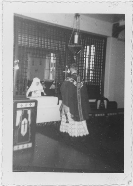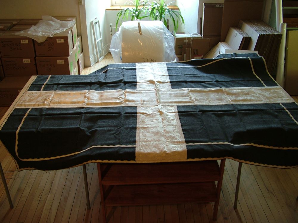 Utilisé lors de la cérémonie de profession perpétuelle, le drap mortuaire symbolisait la rupture totale avec la vie laïque. Cette pièce textile était déposée sur la nouvelle religieuse allongée au sol. Il s’agissait d’une façon de témoigner de son engagement total envers la communauté et envers Dieu. Cette cérémonie symbolisait la dernière étape de passage dans la vie en communauté après le postulat, le noviciat et la profession temporaire.